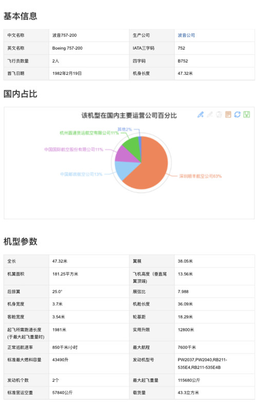 航铁集团飞机制造有限公司提供波音757-200机型:机身长度47.32米,飞行员数量2人,翼展38.05米,机翼面积181.25平方米,飞机高度13.56米,机身宽度3.7米,机舱长度36.09米,客舱宽度3.54米,轮基距18.29米,起飞所需跑道长度1981米。