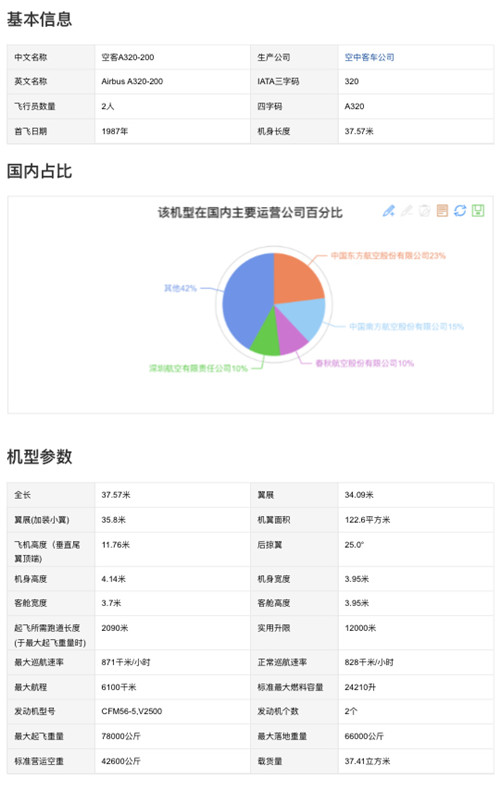 空客A320-200,生产公司来自空中客车公司,全长37.57米,翼展34.09米,机翼面积122.6平方米,飞机高度11.76米,后掠翼25度,机身高度4.14米,机身宽度3.95米,客舱宽度3.7米,客舱高度3.95米,起飞所需跑道长度2090米,实用升限12000米,最大巡航速率871千米/小时,正常巡航速率828千米/小时,最大航程6100千米,标准最大燃料容量24210升,发动机型号CFM56-5和V25000,发动机个数2个,最大起飞重量78000公斤,载货量37.41立方米。